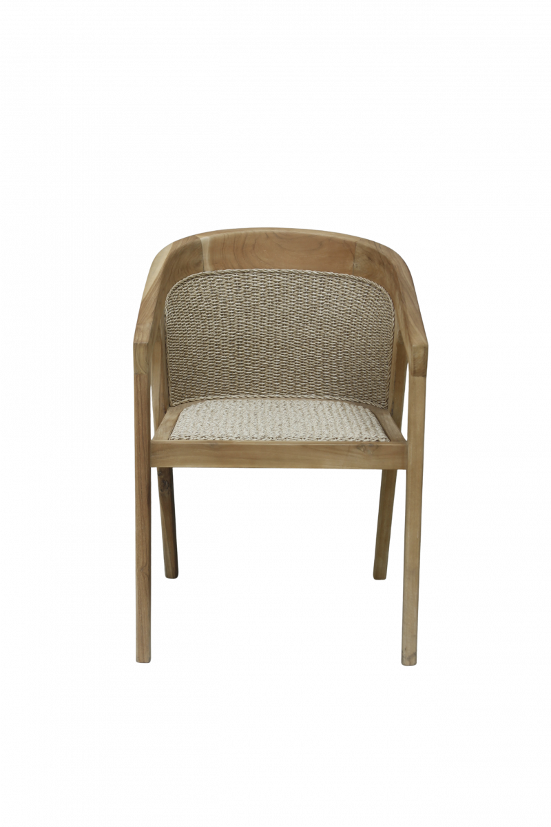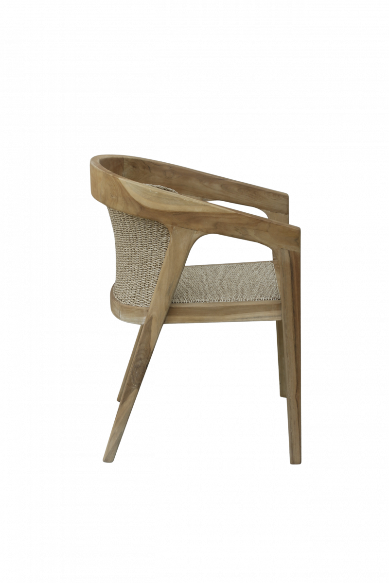 This beautifully crafted armchair highlights the natural charm of solid wood combined with a handwoven rope seat and backrest. Designed with softly curved armrests and a supportive woven structure, it offers both comfort and timeless appeal. The open weave allows airflow, making the chair comfortable for everyday use while maintaining a light, natural look.