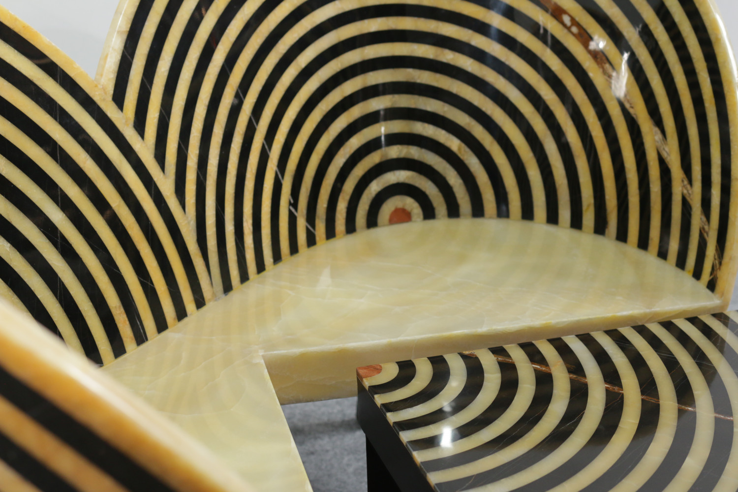 The Genso Bended Love Seat & Table Set combines sculptural curves with the richness of natural stone. Crafted from Onyx Pretoria and Noir St. Laurent, the set highlights the natural translucency of onyx, contrasted by the depth and precision of dark stone accents.