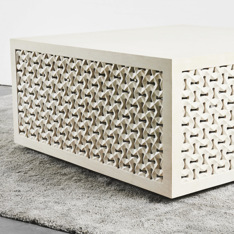 Lattice Coffee Table presents itself as a calm, grounding presence. Crafted from Moca Cream limestone, its soft surface reveals the stone’s natural tones with a warm character, while the lattice detailing creates a subtle play of shadow that adds depth without excess.