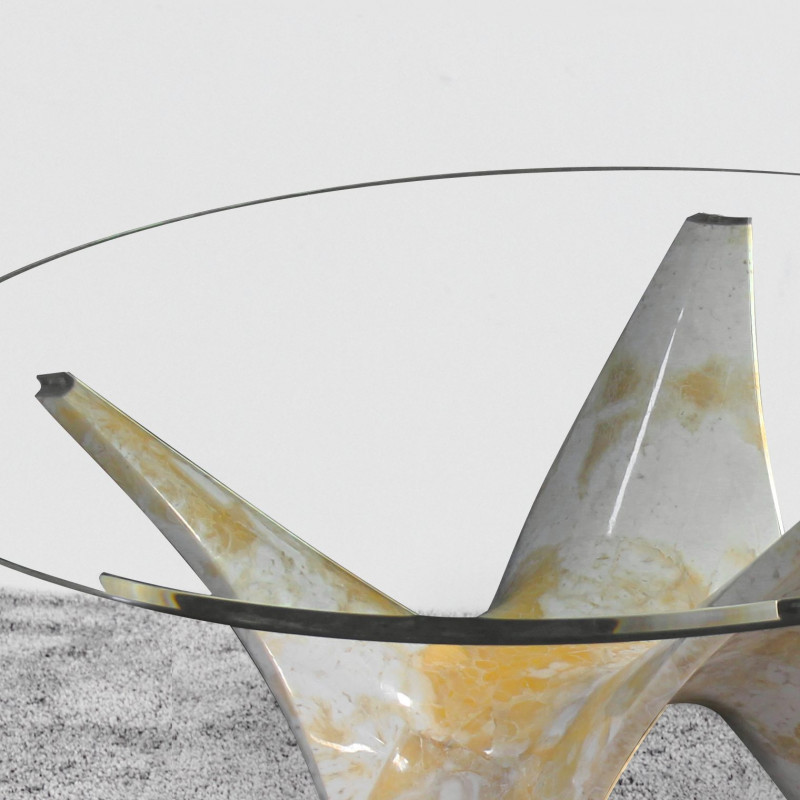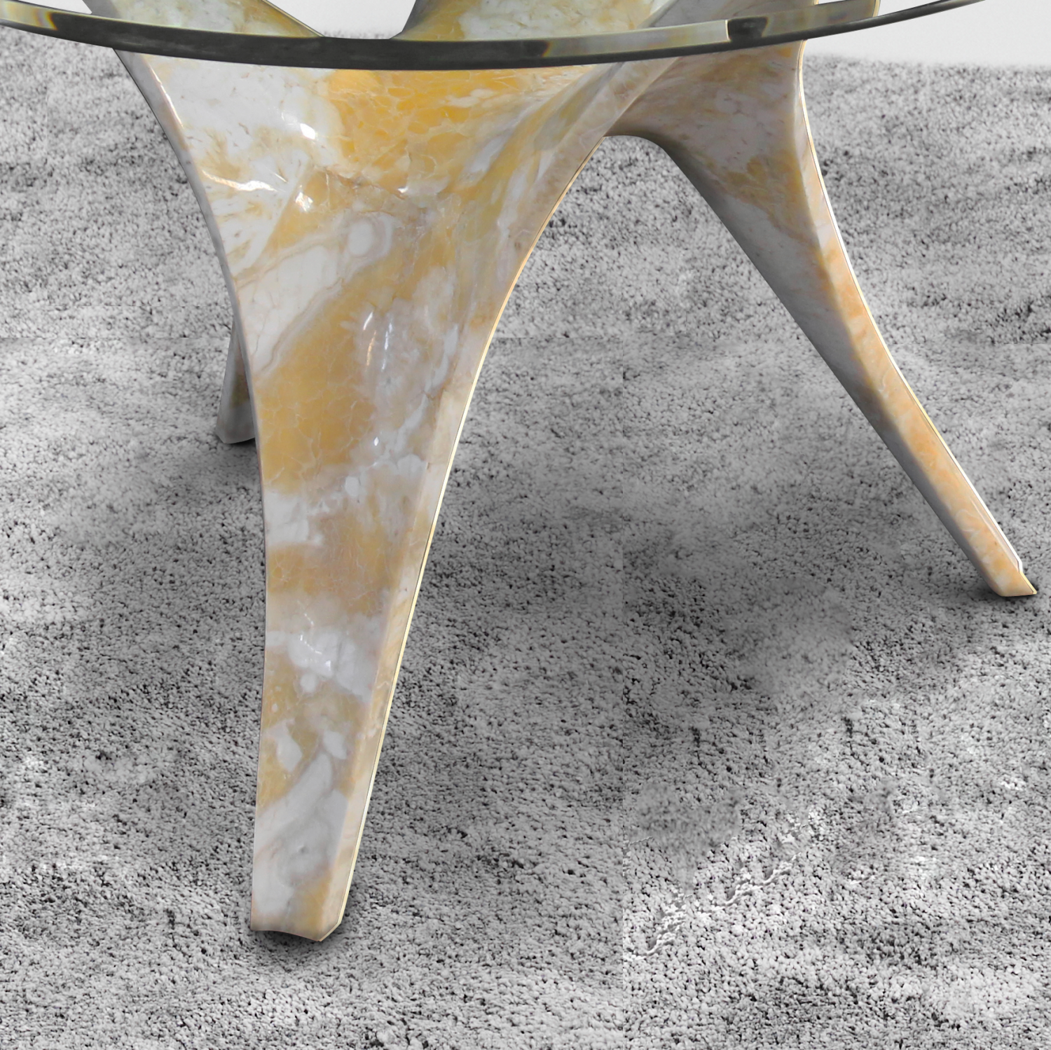 A light silhouette paired with the natural warmth of onyx. The Telara Table features flowing legs crafted from Onyx Pretoria Yellow, supporting a clear glass top that brings balance and an airy presence to the space. A quiet statement that enhances the room without overwhelming it.