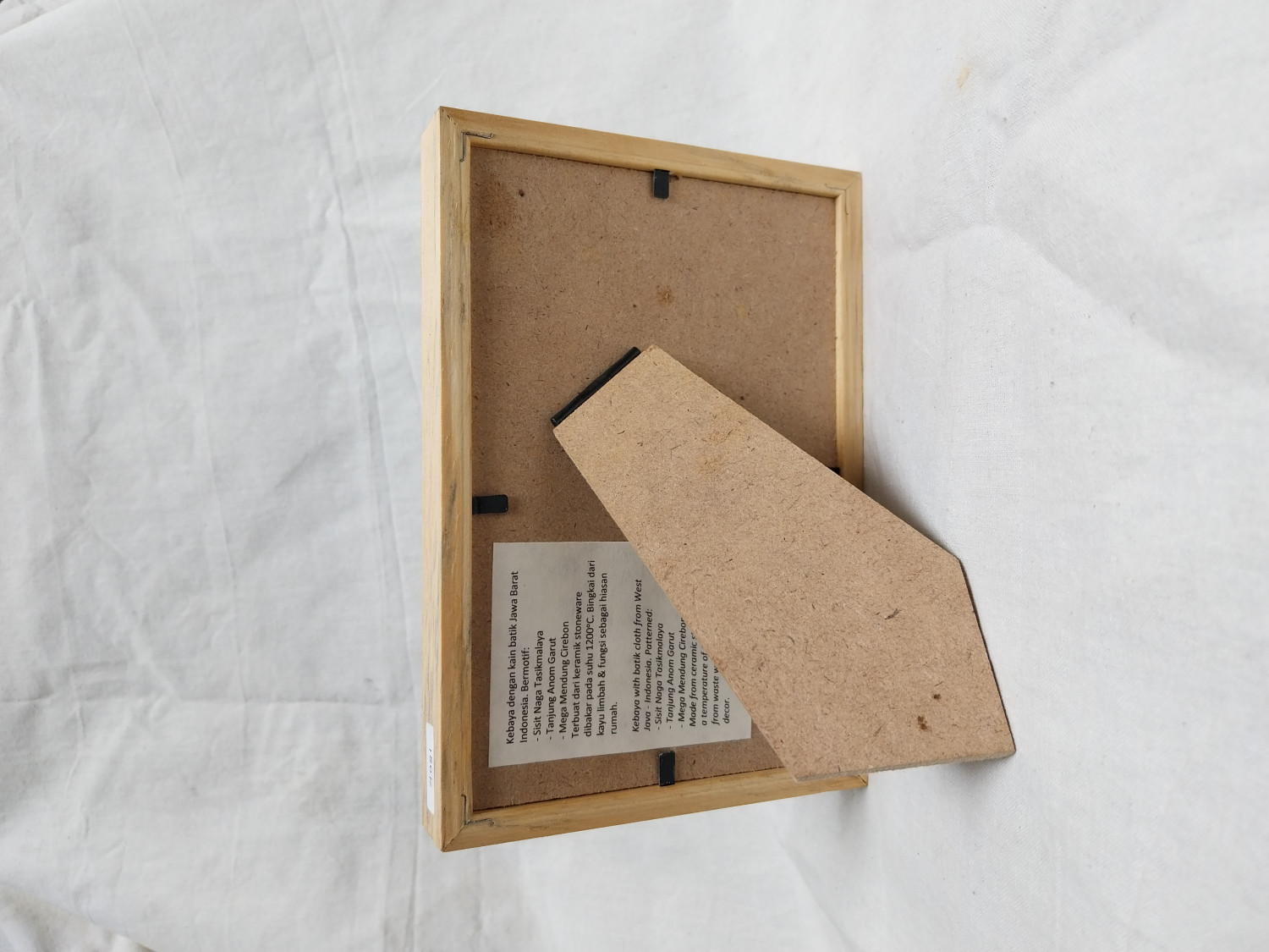 Bentuk kebaya dengan berbagai macam kain batik dari Jawa Barat. Terbuat dari tanah liat stoneware yang dibakar pada suhu 1.200o C. Bingkai terbuat dari kayu limbah. Berfungsi sebagai hiasan meja atau hiasan dinding.