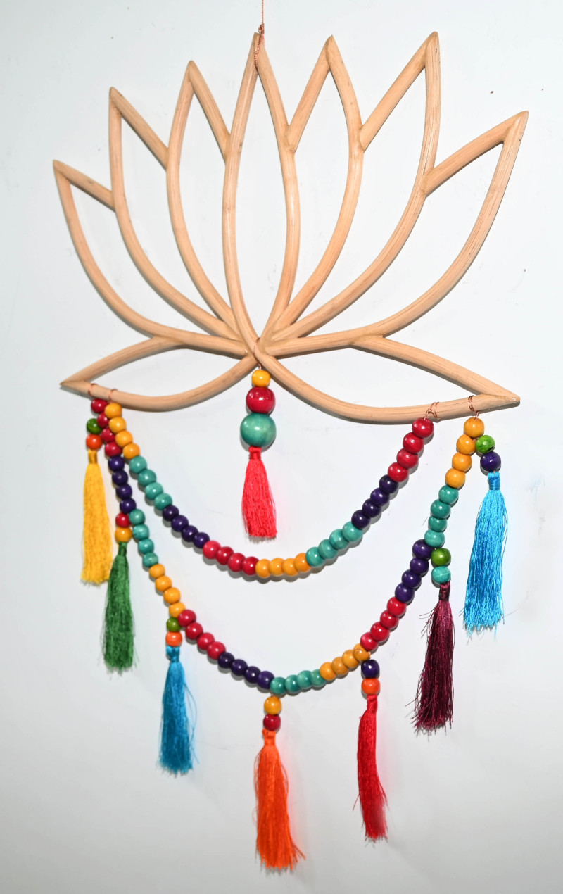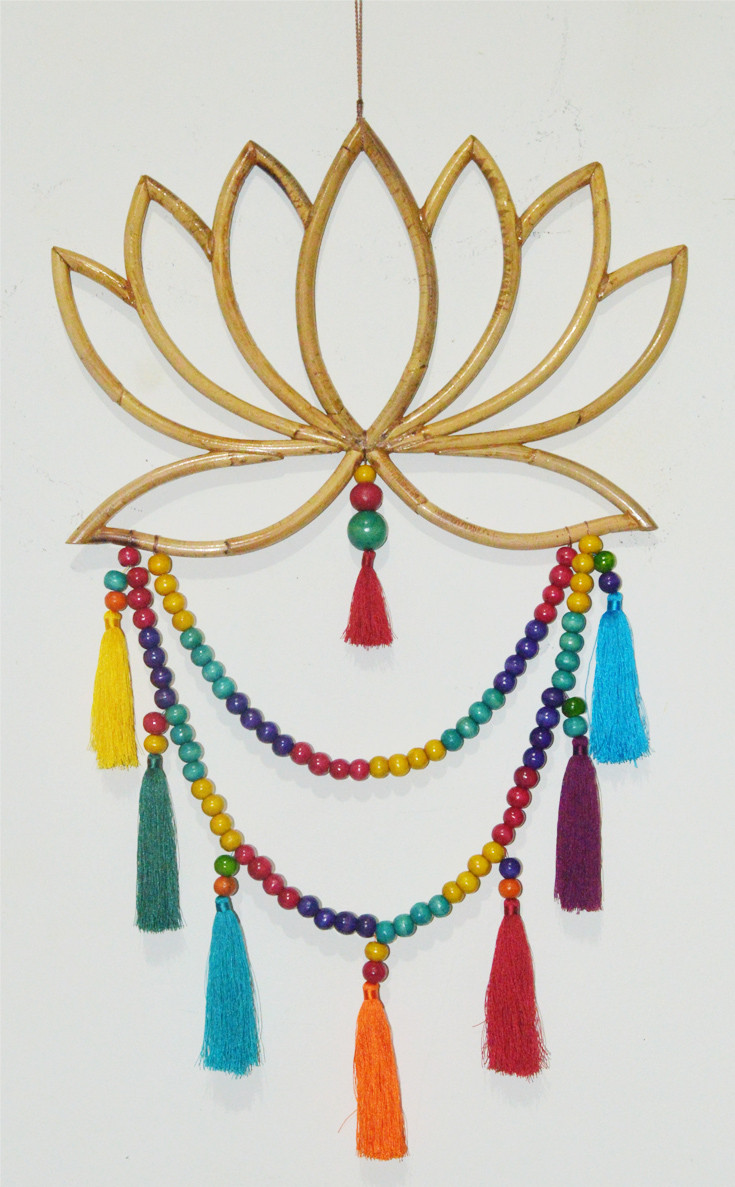 Ornamen dari rotan yang didesain untuk pajangan dinding dengan motif bunga lotus, menambah kesan menarik dengan rangkain bead dan rumbai warna wari pelangi.