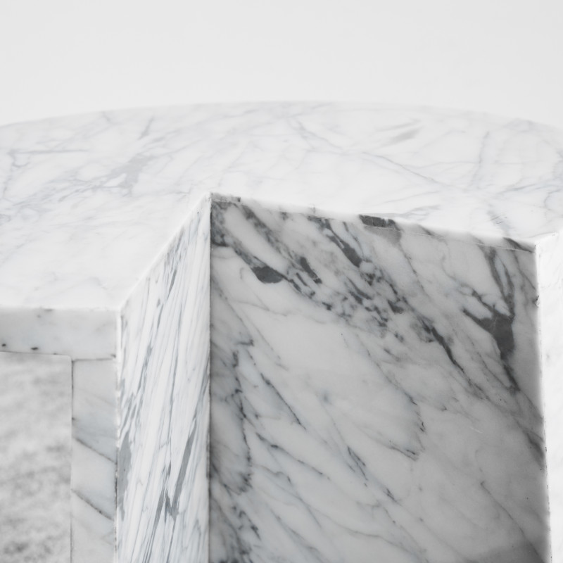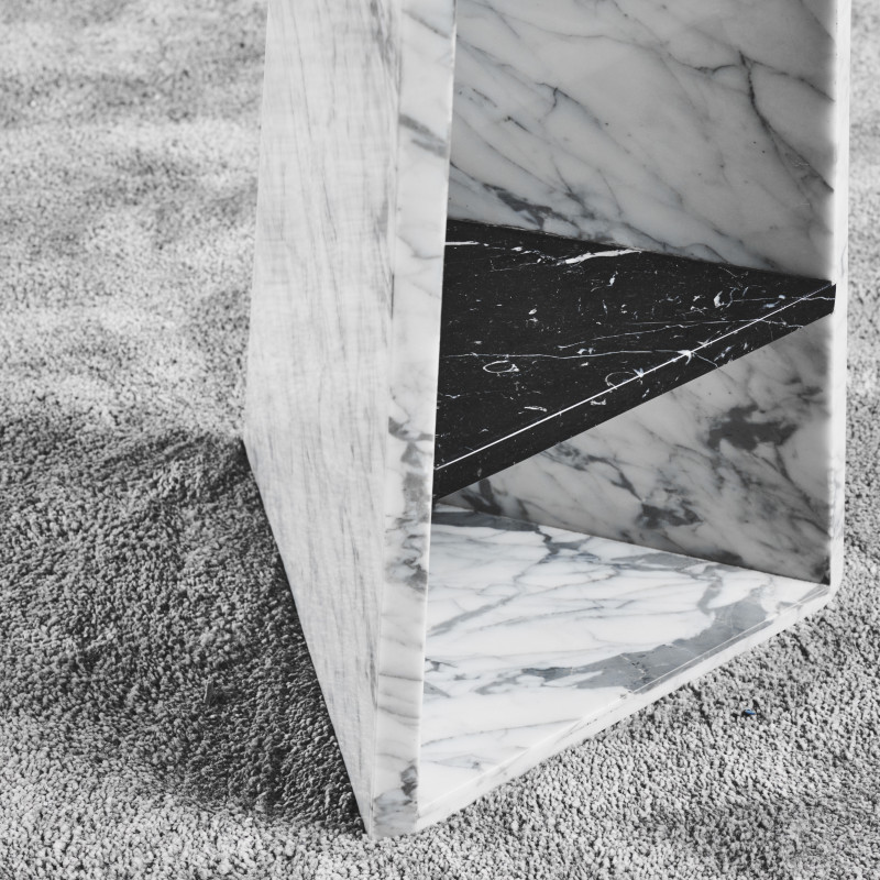 Designed for elegance and versatility, the Slais Side Table pairs the serene luminosity of Statuario Marcopolo Marble, known for its soft, flowing white veins, with the dramatic depth of Nero Marquina, a deep black marble with sharp, striking streaks. The combination emphasizes contrast while maintaining harmony in design.